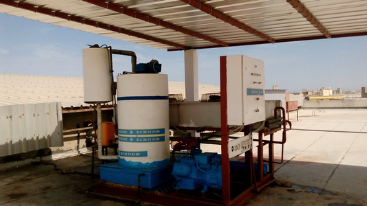 Une fabrique de glace de capacité de 7T/24 h déversant dans une chambre de stockage de la glace d’un volume de 75.72 mᶾ.